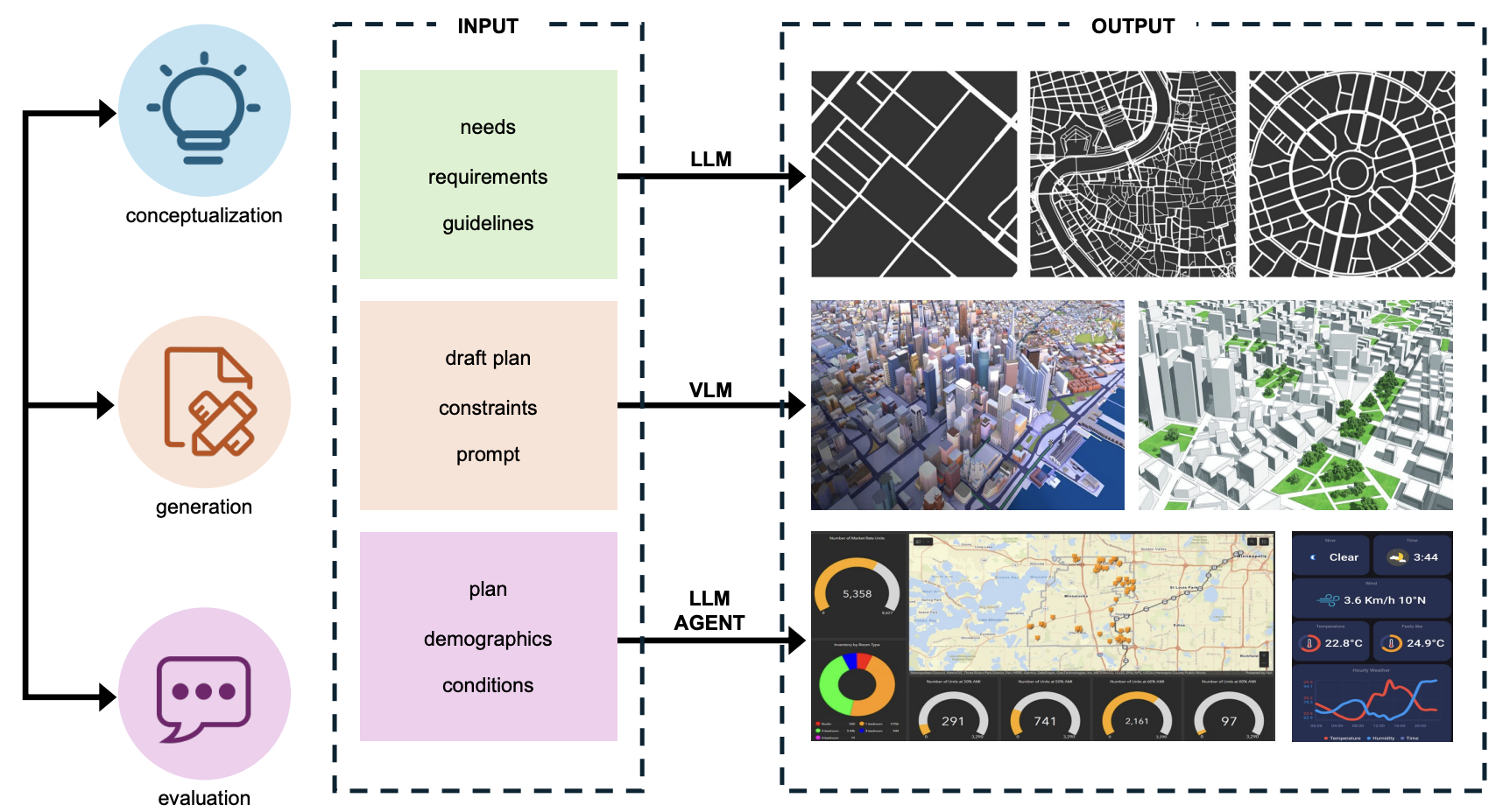 针对传统方法的不足,研究团队创新性地提出了一个包含概念设计(Conceptualization)、方案生成(Generation)和效果评估(evalsuation)三个核心阶段的闭环框架。该框架由大语言模型、视觉大模型(VLM)和大模型智能体(LLM Agent)协同驱动,为人类规划师提供全流程的智能辅助。