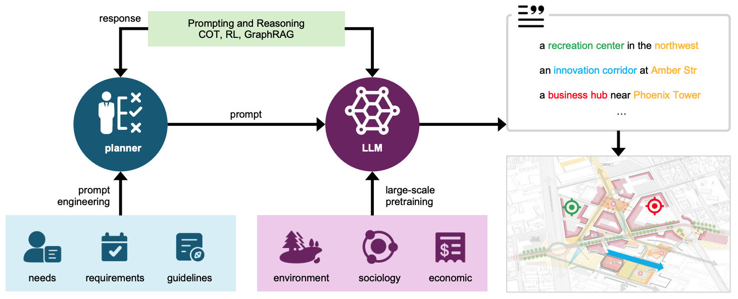 图1.提出的大语言模型驱动的城市规划框架。该框架整合LLM、VLM和LLM智能体,形成“概念-生成-评估”的协同工作流