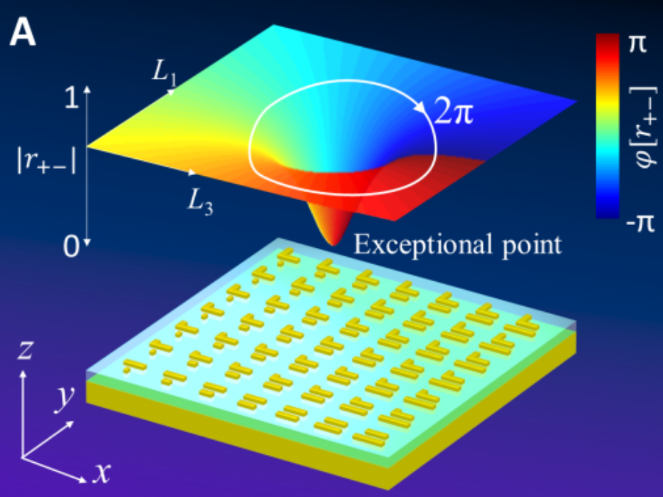 宋清华团队长期致力于电磁超构表面、光子晶体等微纳光学领域的研究。在法国国家科研中心从事博士后工作期间,宋清华就提出了一种全新的相位调控方法,研究了非厄密超构表面的拓扑性质,探讨了其受拓扑保护的360度相位实现方法。研究结果表明,通过设计非厄密拓扑超构表面,可以产生一个奇异点。奇异点在光学当中也是一种“龙卷风”的“风眼”,围绕这个“风眼”一圈,光的相位可以产生360度的累积。而且这种360度相位累积受该“风眼”拓扑保护,与所围绕的路径无关。这一研究成果后来发表在《科学》(Science)杂志上。